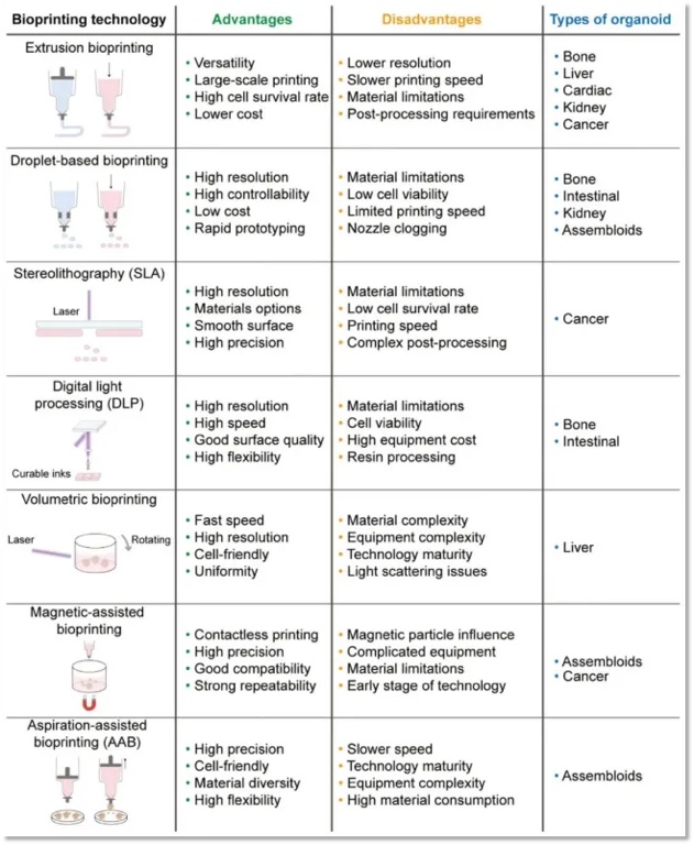 1) 用于类器官三维生物打印的技术及其优缺点:该研究系统地总结了多种生物打印技术,包括挤出式生物打印、基于液滴的生物打印、立体光刻、数字光处理、体积式生物打印、磁辅助生物打印和抽吸辅助生物打印。对于每种技术,研究深入探讨了其优点(例如,挤出式生物打印具备良好的通用性和大规模打印能力,立体光刻则以其高分辨率和多样的材料选择而著称)、局限性(如材料的限制、打印速度较慢等)以及适用的类器官类型。这为研究人员在选择合适的生物打印技术时提供了重要的参考依据。
