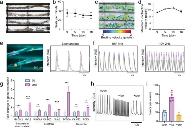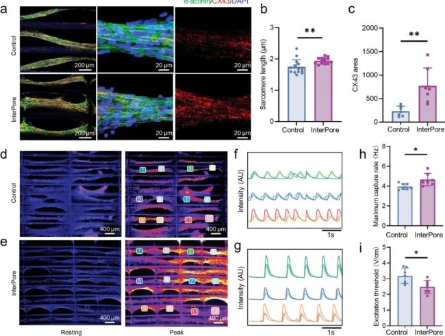 近期,西安交通大学李涤尘教授与贺健康教授团队基于自主开发的静电打印技术设计并制造了一种具有各向异性结构、纵向连通多孔的“InterPore”微米纤维生物支架,实现了具有高密度细胞定向排列的活性心肌组织制造。微米纤维支架中相互连接的多孔能够动态地、细胞介导地重塑纤维蛋白水凝胶,从而形成连续且机械稳定的高密度定向细胞束。与具有网格式独立孔的支架相比,大鼠原代心肌细胞形成的定向活性心肌组织显著促进了电生理特性和同步收缩功能。使用多重接种策略,该团队实现了8×107个/mL的等效细胞接种密度,促进了多细胞、血管化心肌组织的形成,并保障了组织的高活性和完整性。进一步,使用该策略与人源干细胞诱导心肌细胞相结合构建出了定向的活性源心肌组织,并随时间推移逐渐实现功能成熟。这些工作证明了InterPore微米纤维支架在心肌组织工程、药物筛选和临床治疗中的具有巨大潜力。