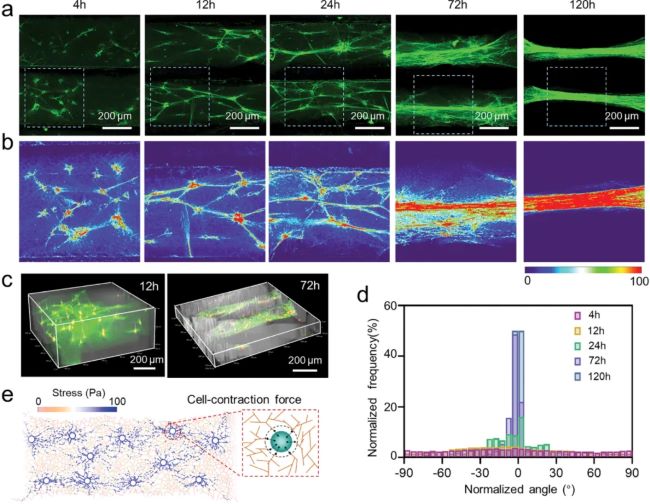 图4 “InterPore”支架内细胞介导的纤维蛋白水凝胶各向异性重塑微观演化过程