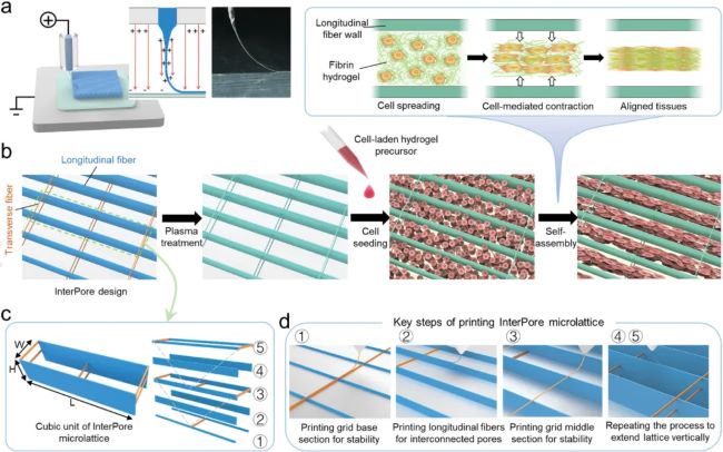 图1 “InterPore”微米纤维支架设计制造与引导高密度细胞定向排列原理图
