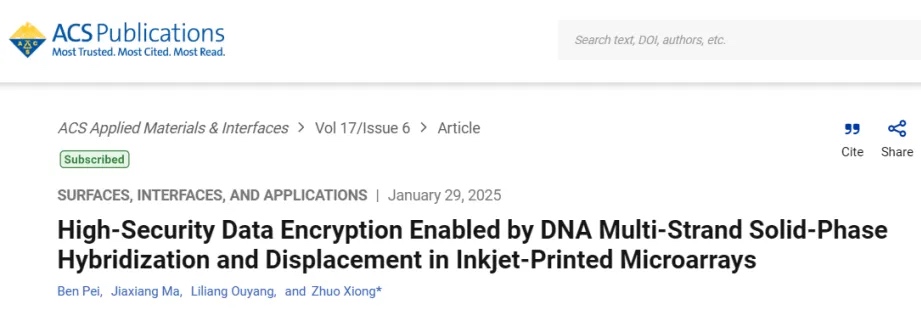 Pei B, Ma J, Ouyang L, et all. High-Security Data Encryption Enabled by DNA Multi-Strand Solid-Phase Hybridization and Displacement in Inkjet-Printed Microarrays[J]. ACS Applied Materials & Interfaces, 2025,17(6): 10179-10190.