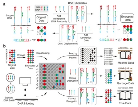 基于这一基本原理,DNA分子可以作为加密材料用于各种形式的数据加密。如图1b中的例子所示,原始数据“CORRECT”被编码为多色荧光组合点并进行加密。通过喷墨打印数据和干扰DNA,荧光数据点被重新排列形成编码掩盖数据“ABCDEFGH”的图案。读取该图案时,只能获得掩盖后的数据。当加入错误解密DNA时,读取荧光组合点将产生垃圾数据。唯有正确的解密DNA能准确去除干扰DNA,使真实数据得以被还原。