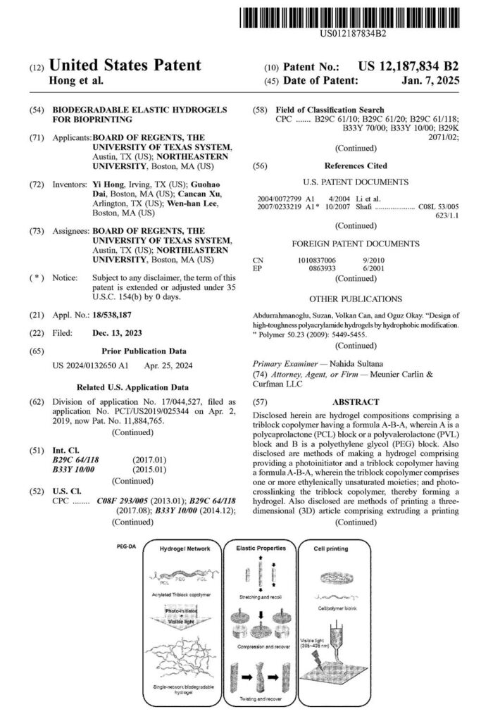 专利题为Biodegradable elastic hydrogels forbioprinting,获取链接:https://coe.northeastern.edu/news/patent-for-new-material-for-3d-printing-of-living-tissues/