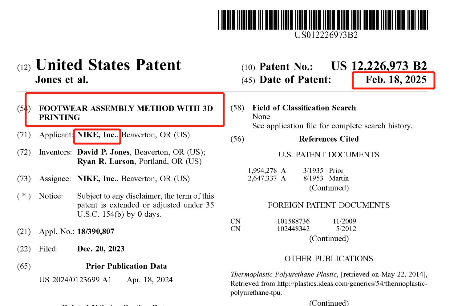 2025年2月,美国专利商标局(USPTO)批准了耐克的一项关于新型3D打印鞋类制造工艺的专利。这项技术突破在于将数字设计直接3D打印到织物材料上,用于制作鞋面,并能直接在上面3D打印出鞋底,摒弃了传统的两部分制鞋方法。
