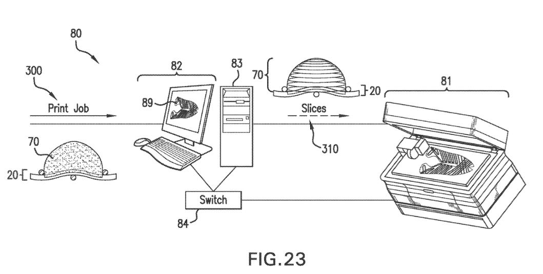 此外,这项专利还展示了如何将鞋底直接打印到已经成型的鞋面上,以及如何通过添加额外的部件,如鞋垫,来改善穿着体验。而且,这项技术不仅仅局限于运动鞋,还可以应用于正装鞋、休闲鞋、凉鞋等多种类型,应用十分广泛。
