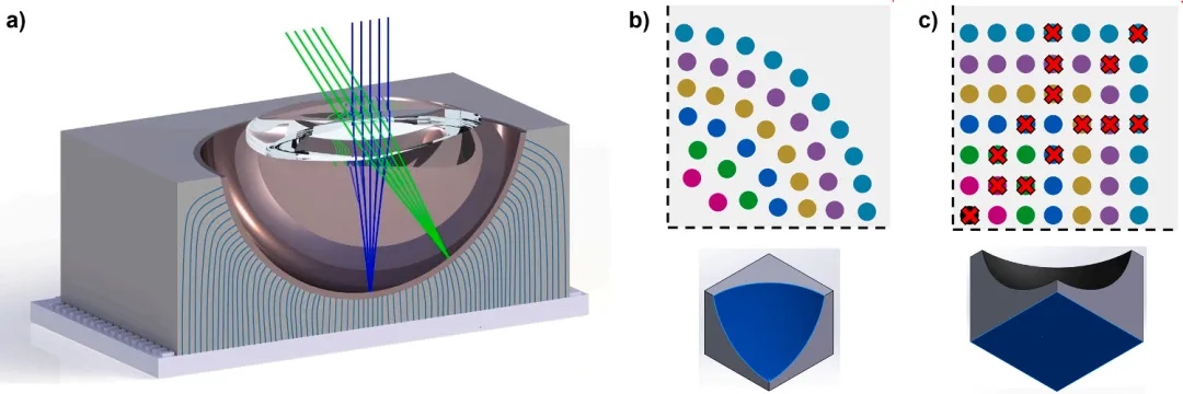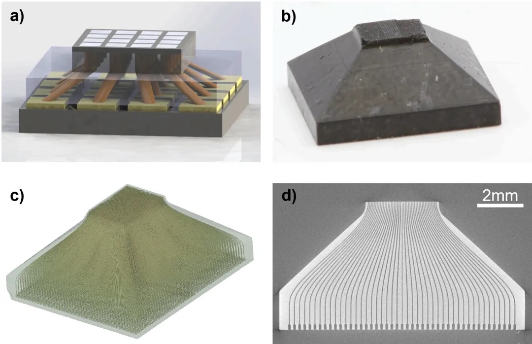 休斯研究实验室作为波音与通用汽车共同孕育的创新引擎,在Tobias Schaedler博士的引领下,通过摩方精密面投影微立体光刻(PμSL)3D打印技术实现了陶瓷封装领域的革命性突破。这项技术不仅攻克了传统工艺的物理极限,更重新定义了微电子系统的集成范式,为半导体产业开启了全新的技术维度。研究团队设计并利用摩方精密microArch® S230 (精度:2 μm)3D打印系统打印后高温热解得到含有通孔阵列的陶瓷中介层,其中通孔的直径与间距分别小至9 μm和18 μm。在此基础上,采用熔融渗透技术对通孔进行金属化处理,构建了电气路径,开创了通孔布线的新篇章,实现了包括弯曲和倾斜通孔在内的复杂布线,为微电子系统的三维集成封装提供了创新方案。