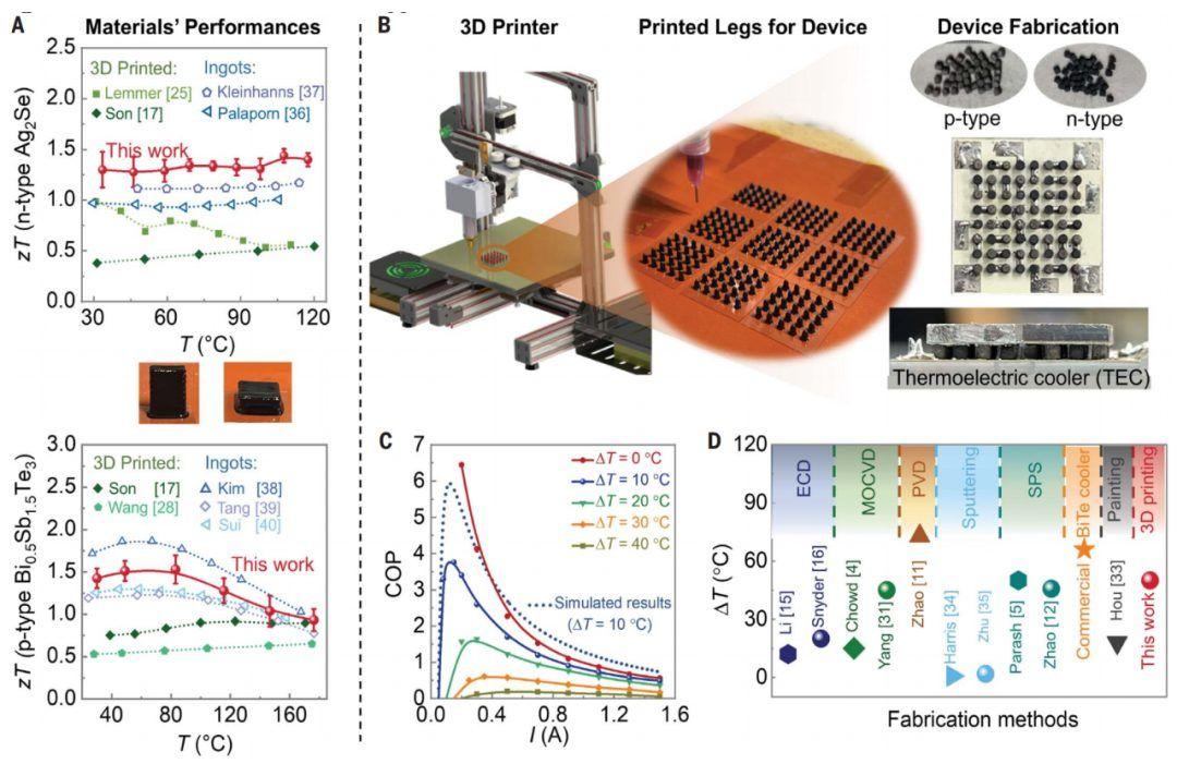 热电冷却器,也称为固态制冷器,可通过电流将热量从设备的一侧传递到另一侧,从而实现局部冷却。热电冷却器使用寿命长、不易泄漏、尺寸和形状可调,且没有移动部件(如循环液体),因此非常适合各种冷却应用,例如电子产品。然而,用锭材制造热电冷却器成本高昂,而且会产生大量材料浪费。此外,热电冷却器的性能仍然有限。