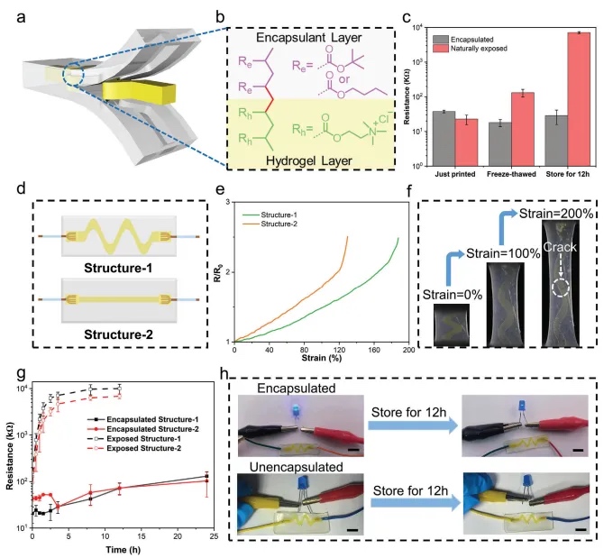 对改性凹凸棒土增强的离子导电水凝胶进行封装和结构设计的方法,以提高其在干燥或湿润环境中的稳定性。通过使用基于聚氨酯的透明弹性体对水凝胶进行封装,成功解决了水凝胶在环境变化下的脱水或吸水问题,显著提高了其存储时间。此外,设计的传感器结构,如正弦形状的应变传感器,能够扩展水凝胶的应变感应范围至175%,增强了其在实际应用中的性能。封装后的传感器在室温下存储12小时后仍能保持其导电性和传感性能,证明了封装策略的有效性。