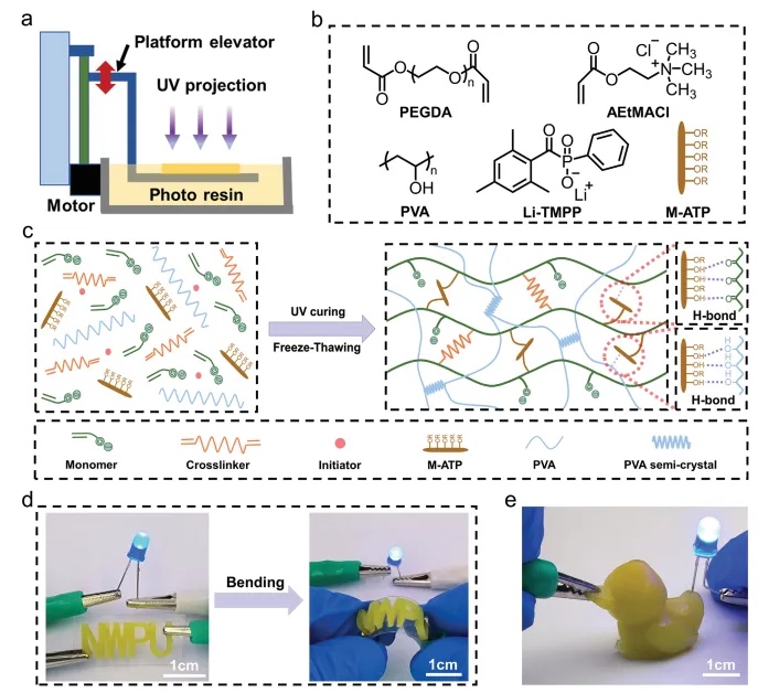 通过使用𝜸-甲基丙烯氧基丙基三甲氧基硅烷(MPS)适度修饰的ATP刚性颗粒和PVA半晶态双重网络增强,制备了机械强度高和导电性好的N,N,N-三甲基乙氨基氯化物(AEtMACl)基水凝胶。利用数字光处理(DLP)技术,可以快速打印出这种复合水凝胶,克服了传统水凝胶在3D打印上的局限性。