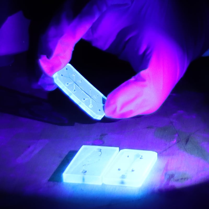 在紫外光下,使用 Huachao Mao 的 3D 打印创新技术在普渡大学增材和智能制造实验室打印的微流体装置的特写图。(普渡大学照片/约翰·奥马利)