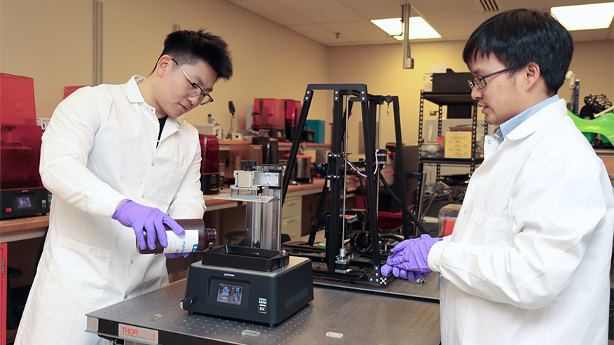 △普渡大学工程技术学院博士后研究助理单玉洁和工程技术助理教授毛华超准备使用 3D 打印机打印微流体装置样品。(普渡大学照片/约翰·奥马利)