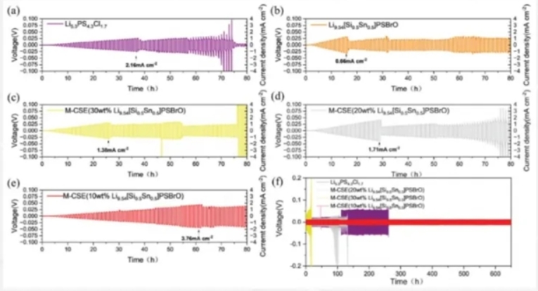 图3.a-e)不同电解质结构的对称锂金属电池的临界电流密度(CCD)。f)在1.5 mAcm-2电流密度下的循环稳定性。