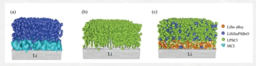 图1.a)具有不稳定界面的电池,其中不断生长的界面层导致显著的过电位。b)具有SEI界面的电池,锂枝晶穿透发生。c)含有M-CSE的电池。