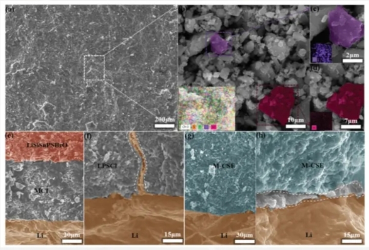 图2.a-d)不同放大倍数下M-CSE的截面扫描电子显微镜(SEM)和能量色散X射线光谱(EDX)图像。e,f)Li|LiSiSnPSBrO|Li和Li|LPSCILi对称电池在静置40小时后的SEM图像。g,h)Li|M-CSE-LPSCI-M-CSE|Li对称电池在不同放大倍数下的SEM图像。