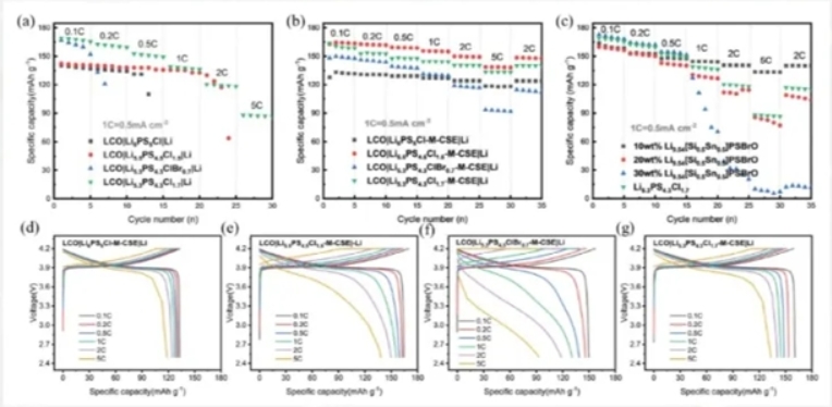 图4.不同ASSLMB配置的倍率性能(0.1-5C),以及相应的充放电曲线,具体结构如下:a)单一电解质,b)不同比例的MCSE,c)添加M-CSE后的电池,d-g)添加M-CSE后的充放电曲线。