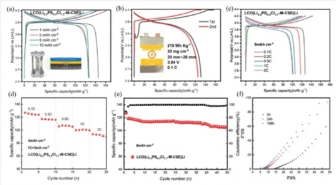 图6.a)不同面积容量下的LCO|LPSCI-M-CSE|Li全固态电池的充放电曲线。b)边长为2cm的LCO|LPSCI-M-CSE|Li方形软包电池的充放电曲线。c-e)面积容量为5 mAhcm-2的LCO|LPSCI-MCSE|Li全固态电池的充放电曲线、倍率性能和循环性能。f)在不同循环时长后的LCO|LPSCI-M-CSE|Li全固态电池的奈奎斯特图。