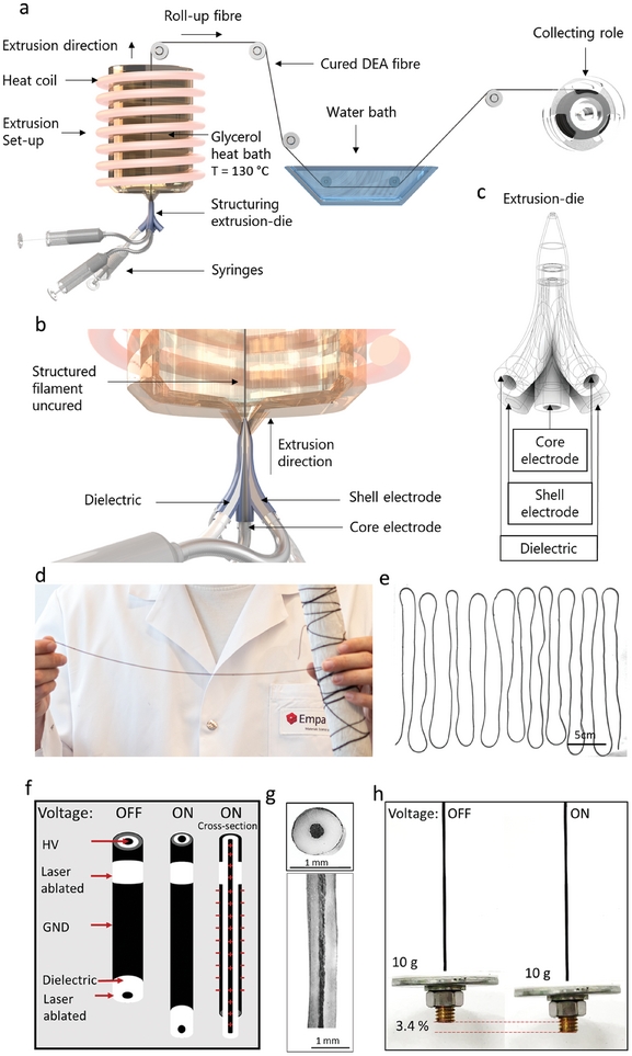 研究人员采用了3D打印技术来生产由软材料制成的复杂执行器组件。这种介电弹性执行器(DEA)由两种不同类型的硅基材料构成:一种是导电的电极材料,另一种是不导电的电介质。这两种材料层层堆叠,正如Empa研究员Patrick Danner所描述的,它们的组合类似于交错的手指。当在电极上施加电压时,执行器会收缩,模拟肌肉的运动;而当电压移除时,执行器则恢复到初始状态。