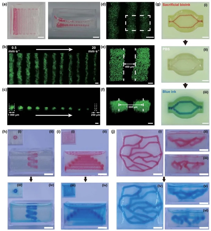 通过嵌入式打印技术,研究了在双相介质中构建复杂三维血管结构的能力,结果表明通过调整打印速度可以精确控制血管直径,并成功构建了多种复杂的血管网络结构。