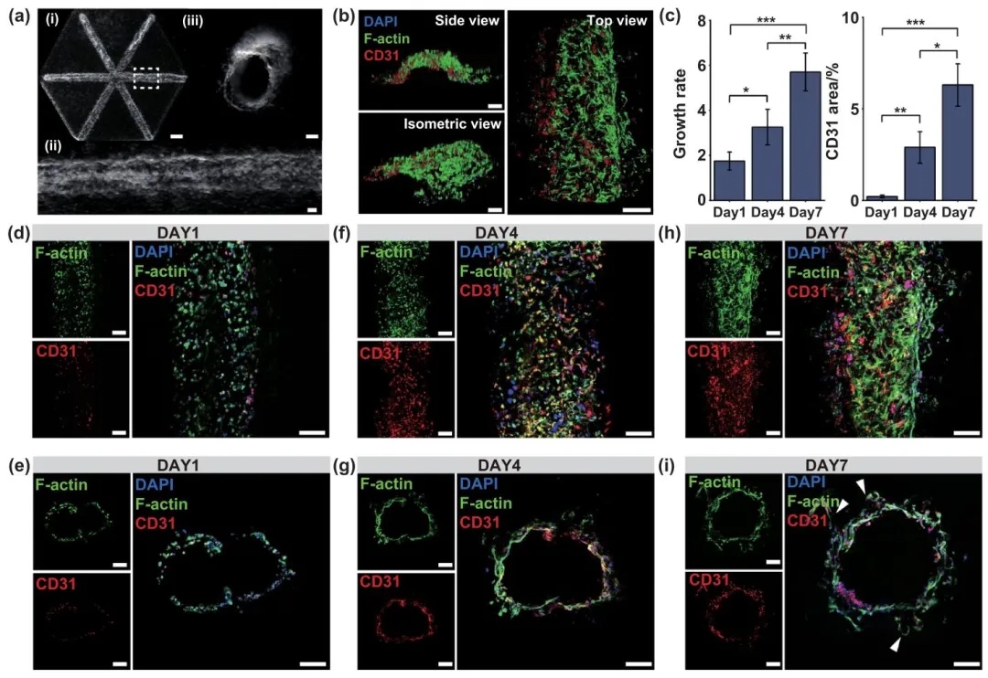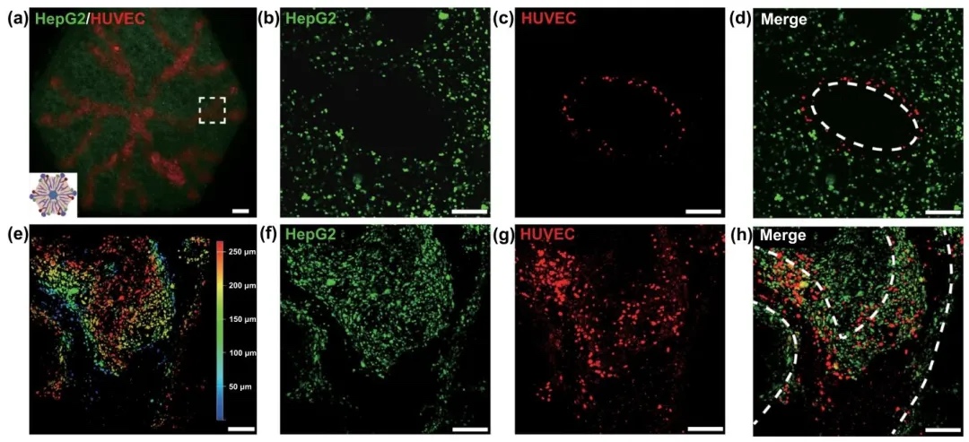 通过将内皮细胞负载的牺牲墨水嵌入双相介质,研究了在体外构建血管化肝组织的过程,结果表明内皮细胞能够在打印结构中形成连续的血管网络,并与肝细胞紧密粘附。