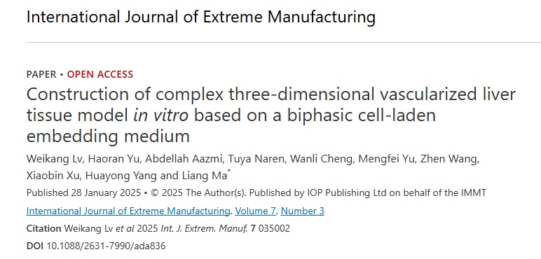 肝脏作为人体最大的消化腺,承担着蛋白质合成、代谢等重要生理功能。然而,药物或疾病引发的肝损伤会影响其再生能力。构建能精准模拟健康人体肝脏生理功能的体外三维模型,对提升实验准确性、推动药物研发和临床应用意义重大。肝脏血管系统复杂,体外构建复杂血管网络,维持充足养分供应,对细胞生长、模拟肝脏异质结构和细胞微环境至关重要。 3D生物打印技术虽在构建复杂肝脏组织方面有进展,但现有方法仍存在诸多局限。例如,同轴挤出打印受喷嘴结构限制,难以形成稳定的分叉微血管;传统牺牲打印的层层堆叠法,因低模量水凝胶黏度低、难以自支撑,不易构建复杂三维血管结构,且细胞载药生物墨水的流变学特性变化会影响打印可行性。同时,现有方法在材料选择上受限,细胞载微球制备复杂、通量低,不利于大规模组织构建。 为解决这些问题,浙江大学马梁教授团队开发出一种可交联的双相嵌入介质,通过混合低黏度生物材料和明胶微凝胶,克服了传统方法的局限。相关工作以“Construction of complex three - dimensional vascularized liver tissue model in vitro based on a biphasic cell - laden embedding medium”为题发表在《International Journal of Extreme Manufacturing》上。