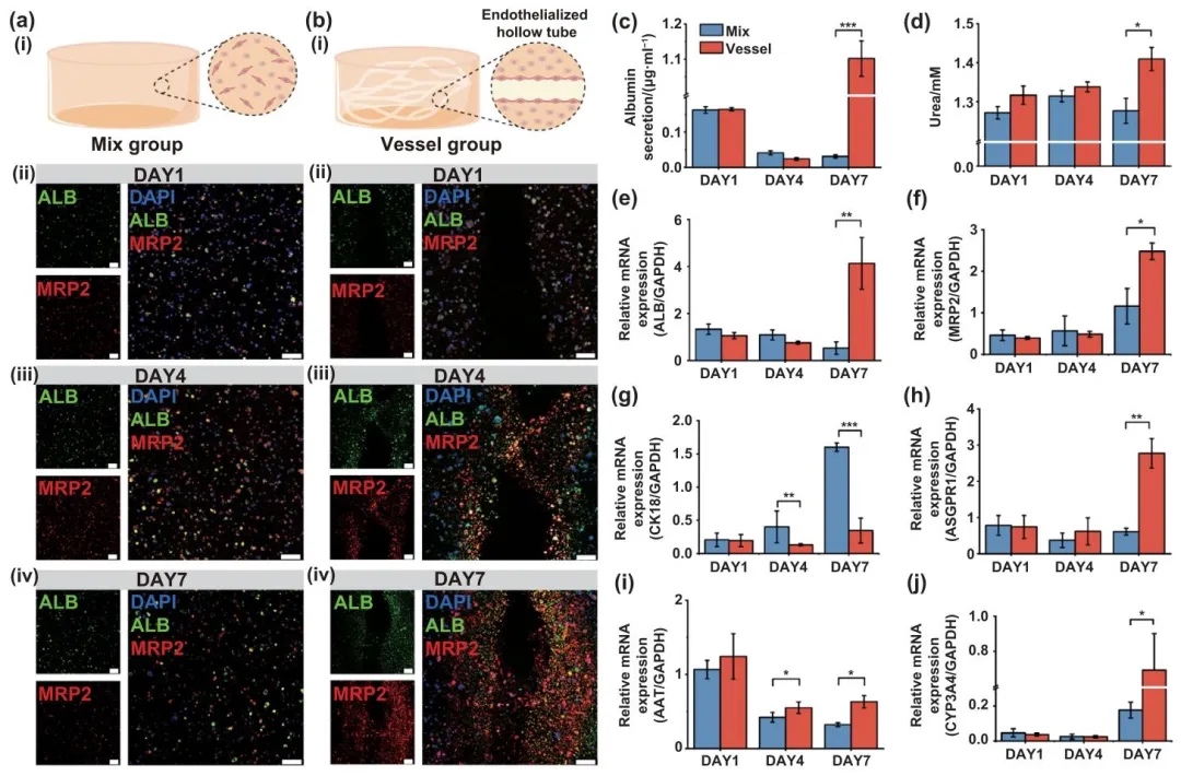 通过对血管化和非血管化肝组织的功能进行对比分析,研究了血管化对肝组织功能的影响,结果表明血管化肝组织在蛋白质合成、代谢功能和肝损伤标志物表达方面均优于非血管化模型。