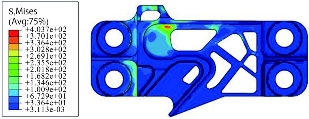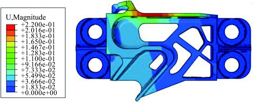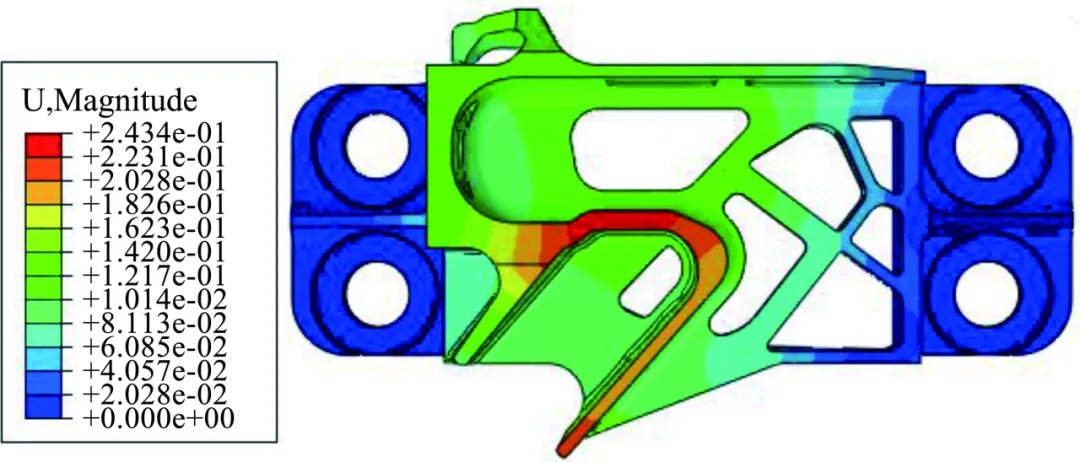 经过有限元分析,得到负压工况和止动块破损工况下的Mises应力云图(图7、图8),可知两种工况下应力最大位置在螺栓孔附近的R区,且均未超钛合金材料许用强度,拓扑优化结构区域在止动块破损工况下应力水平相对较高。同时得到位移云图(图9、图10),显示结构最大位移出现在加载位置附近,两种工况下变形均较小,整体刚度较好。