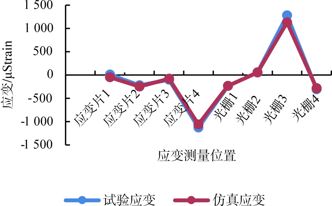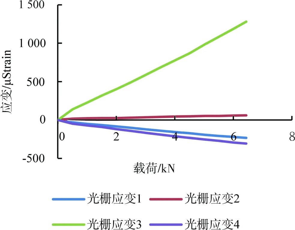 应变片布置4个单向应变片(图13),对于应变片无法粘贴的部位,采用光纤光栅应变测量方法,布置4个光栅(图14)。通过对长250mm、宽80mm、厚3mm的铝板进行3次加载试验,标定光纤光栅应变测量工具,确定修正系数为1.77。