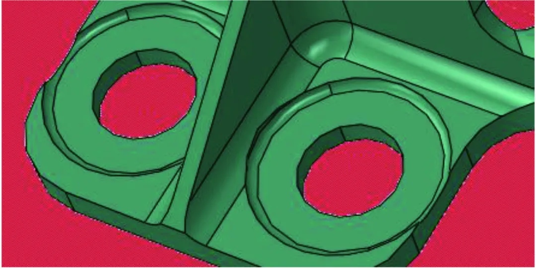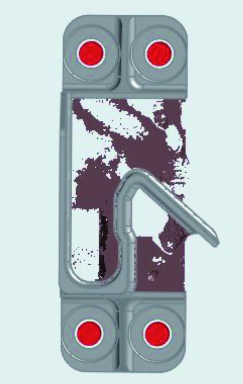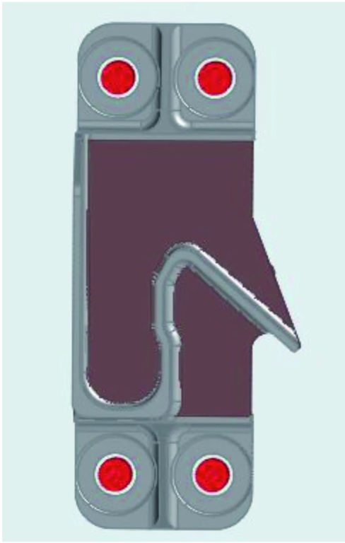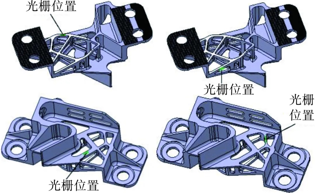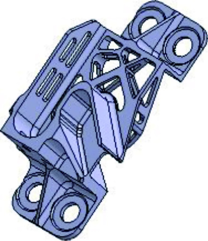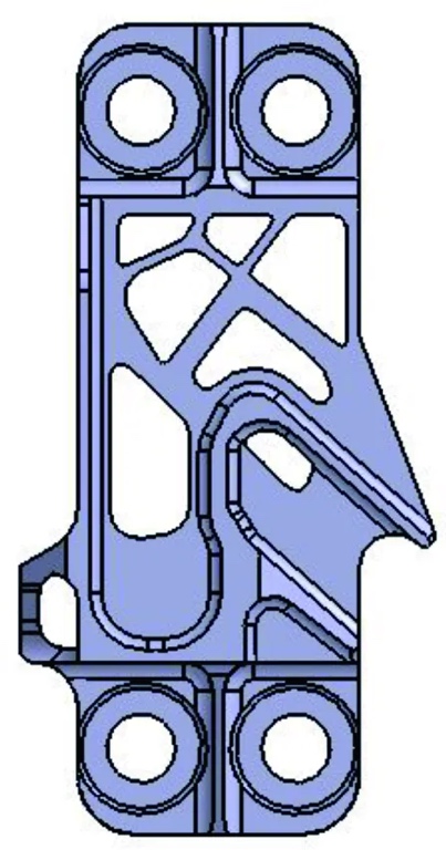 增材制造工艺为零件设计带来更多可能,零件拓扑优化流程涵盖零件设计区域定义、结构拓扑优化设计、几何重构和结构验证四个环节。文章按此流程,选用Ti-6Al-4V钛合金材料,综合考虑两种载荷工况,借助Inspire拓扑优化软件开展导向轮槽的拓扑优化工作。以结构刚度为约束条件,体积最小化为优化目标,定义设计区域(图2(a)),得到拓扑优化结果(图2(b)),展示了主要传力路径。之后利用CATIA建模软件进行几何重构,获得最终的导向轮槽零件结构(图3)。