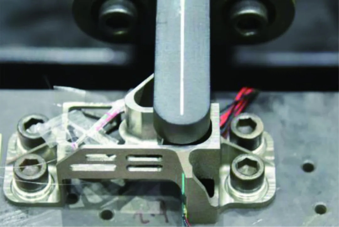 选择止动块破损工况的载荷作为试验载荷,因其应力较大且对拓扑优化区域强度考核明显。试验采用钢质平板底座和圆柱加载头模拟实际工况,底座通过螺栓与试验件连接,加载头几何外形与实际滚轮一致(图11),液压作动器通过加载头加载(图12)。