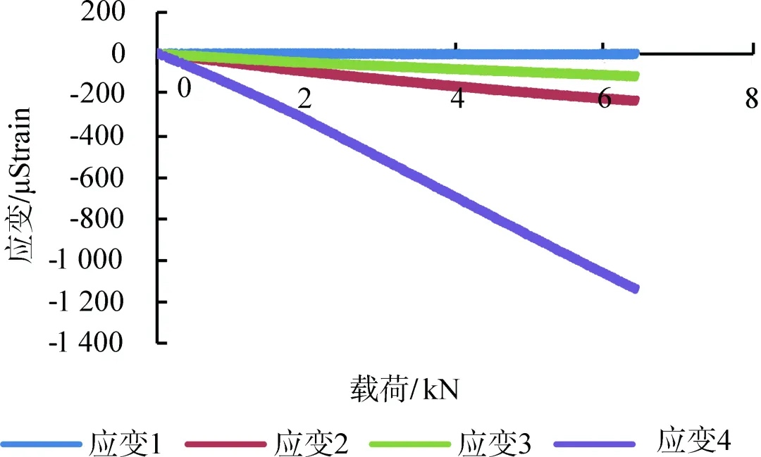 静力试验的载荷-应变曲线(图16、图17)表明,导向轮槽零件在试验载荷加载过程中未出现结构失效,应变随载荷增加呈线性增长。试验测得应变分布趋势与有限元模型分析结果一致(图18),除应变小于100μStrain的位置外,有限元分析应变误差最大值为13%。