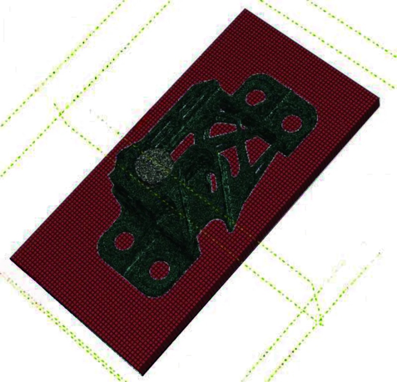 利用ABAQUS分析软件,根据导向轮槽的两种载荷工况建立有限元分析模型。由于零件采用不规则拓扑优化结构,模型选用适应性强的二阶四面体网格单元,总数为336653(图4)。通过建立与导向轴尺寸一致的圆柱结构模拟加载条件(图5),将螺栓孔周围节点与参考点建立Coupling约束固定模型(图6),并建立底板结构模拟周围结构的支撑作用,底板与导向轮槽建立接触属性。