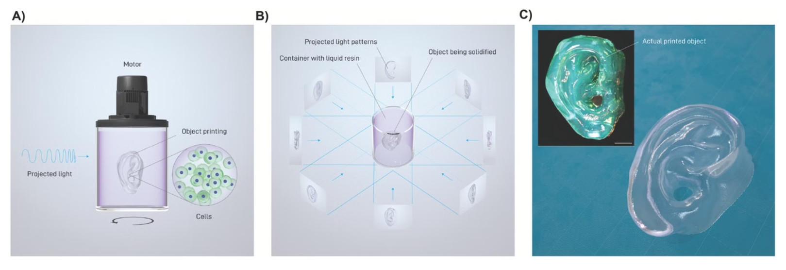 在ENLIGHT项目中,研究人员采用了名为“体积生物打印”的创新技术。这一技术由瑞士公司Readily 3D开发,其核心原理是通过三维光投影将光敏水凝胶快速固化成复杂结构。与传统挤压式生物打印相比,体积生物打印具有显著优势:能够在几秒钟内完成厘米级结构的打印,同时避免了对细胞的剪切力和应力损伤,从而保证细胞的存活率和功能稳定性。