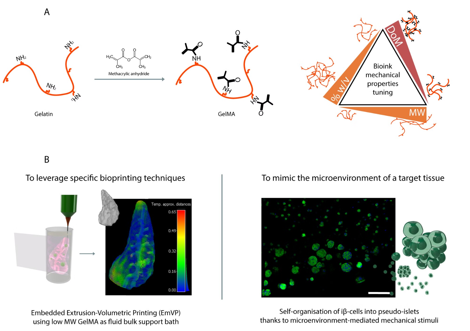 除了先进的打印技术,生物材料的选择同样至关重要。Rousselot开发了一种名为甲基丙烯酰胺改性明胶(GelMA)的新型水凝胶材料。这种材料具有高度的可调性,可以通过调整分子量、甲基丙烯酸酯(MA)修饰程度和浓度来模拟不同类型的组织环境。