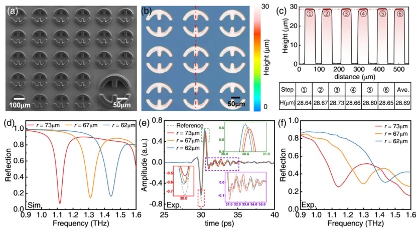 传感器采用了立体的金属—介质—金属三明治结构。相比于传统平面结构,立体结构能够提供更大的太赫兹与物质相互作用空间,从而提高传感灵敏度。在器件制备方面,研究团队采用摩方精密面投影微立体光刻(PμSL)3D打印技术(nanoArch® S130,精度:2 μm)实现了立体器件的高精度制备,相比于传统光刻工艺,极大简化了制备复杂性,显著降低了制备成本,为太赫兹传感器件的高效、低成本制备提供了新的思路(图1)。