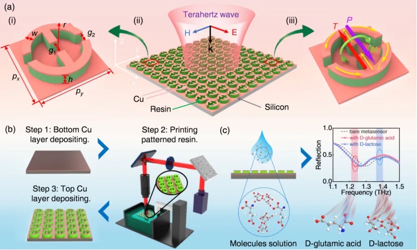 在现代生物传感技术中,太赫兹(THz)光谱因其独特的低能量、非侵入性和非电离特性,逐渐成为生物医学领域的重要工具。由于氨基酸、脂质、蛋白质等许多生物分子的振动、转动能级恰好位于THz频段,太赫兹光谱因此成为检测这些生物分子的理想平台。通过这些分子特有的振动特征,太赫兹光谱可实现物质的特异性识别。然而,由于波长与分子尺度的失配,在分子级别的检测仍然面临着许多挑战,尤其是在检测微量分析物时。基于超表面的生物传感技术,进一步提高了传感灵敏度,因此被广泛应用。然而,传统的太赫兹超表面生物传感器往往依赖于折射率频移,无法充分利用分子的振动指纹特性,因此在混合物检测中存在固有限制。相对于折射率传感,分子振动指纹传感是具有特异性的,这使得它非常适合于混合物的传感。