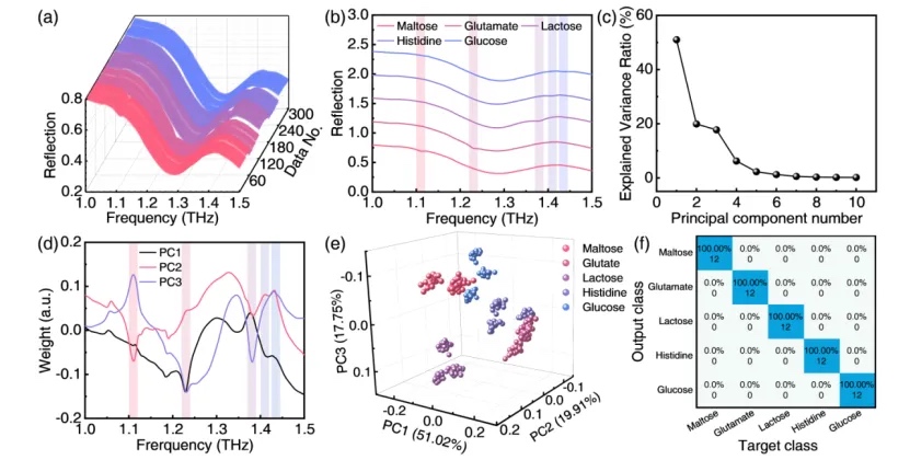 进一步,研究团队结合了机器学习算法,实现了对五种不同分子100%的识别率。在分子识别过程中,研究团队采用主成分分析(PCA)和支持向量机(SVM)相结合的方法,对获取的太赫兹光谱数据进行降维和分类。通过PCA方法,研究人员成功提取了光谱数据中的有效信息,并利用SVM实现了高精度的分子分类(图5)。