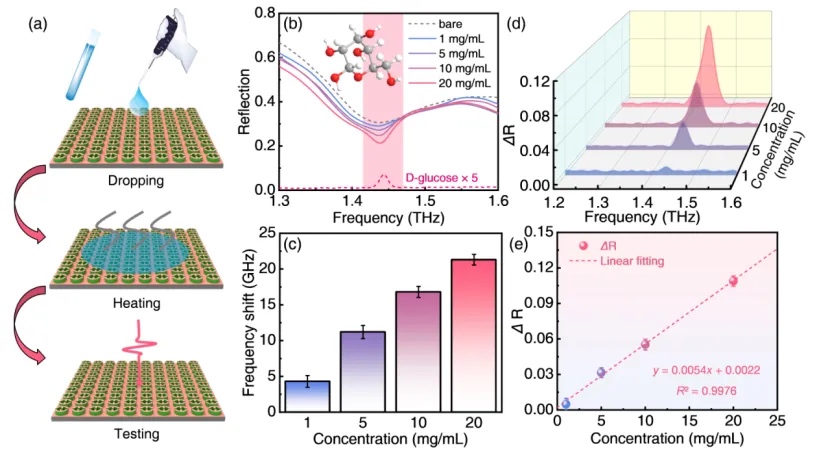 研究团队对制备得到的传感器进行了性能测试。实验结果显示,基于过耦合的Anapole谐振与分子振动模式之间的相互作用,传感器能够在1.44 THz频率下检测到D-葡萄糖溶液,灵敏度可达0.54%/(mg·mL-1)。此外,传感器还能够定量检测D-谷氨酸和D-乳糖及其混合物,展示了其在复杂混合生物样本分析中的巨大潜力(图3、4)。