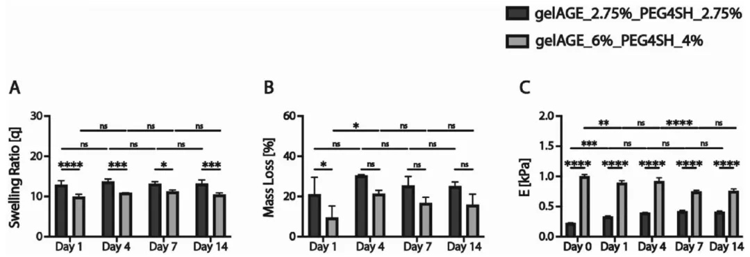 采用溶胀分析、质量损失测定和力学性能测试等实验手段,研究不同浓度(2.75% 和 6%)gelAGE 基水凝胶的物理化学性质。结果显示,低浓度凝胶溶胀率更高、质量损失趋势不同,且两者交联密度有差异;力学测试表明,低浓度凝胶杨氏模量约 0.2 - 0.4 kPa,高浓度约 0.75 - 1.0 kPa,均符合脂肪组织力学范围,适合脂肪细胞培养。