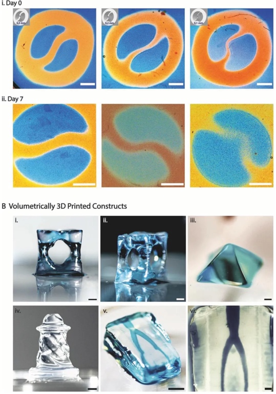 通过打印不同形状和尺寸的3D结构,如S形细丝、空心笼、金字塔和分支结构等,并对其进行观察和分析,研究gelAGE基树脂的体积打印分辨率和成型能力。结果表明,该树脂能实现约100μm的特征分辨率,可制造复杂结构,如自支撑结构、带尖锐边缘的结构和可灌注结构,为软组织工程构建物的制造提供了可能。