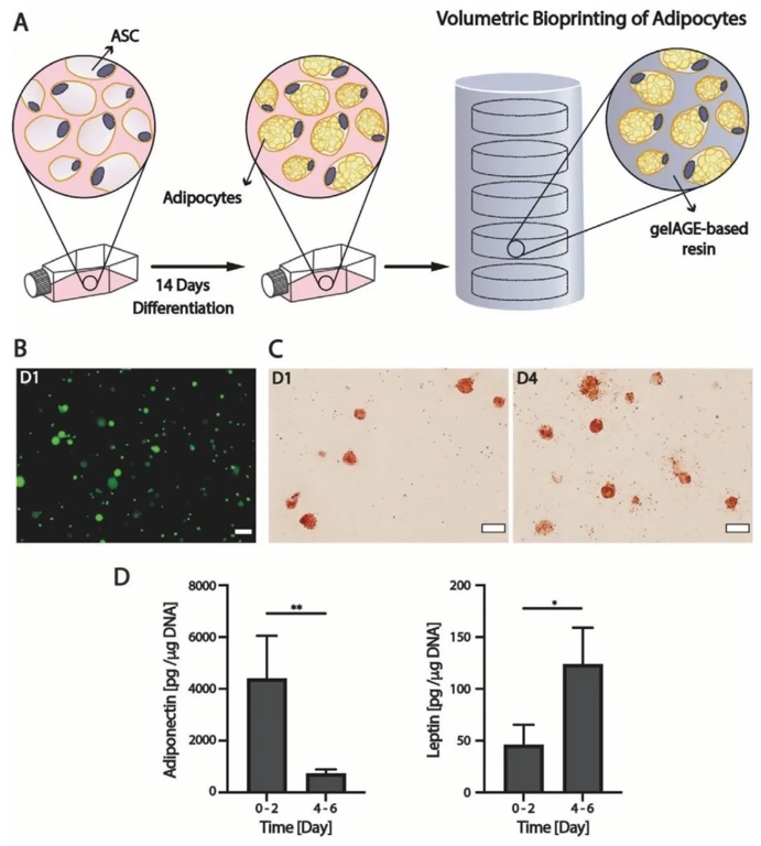 将脂肪来源的间充质干细胞(ASC)负载于gelAGE基树脂中进行体积生物打印,随后进行成脂分化培养,通过活/死染色、油红O染色和基因表达分析等方法,研究细胞在树脂中的存活、分化情况。结果显示,打印后细胞存活率高,培养14天后ASC成功分化为脂肪细胞,两种不同浓度的gelAGE基树脂均为成脂分化提供了有利环境。
