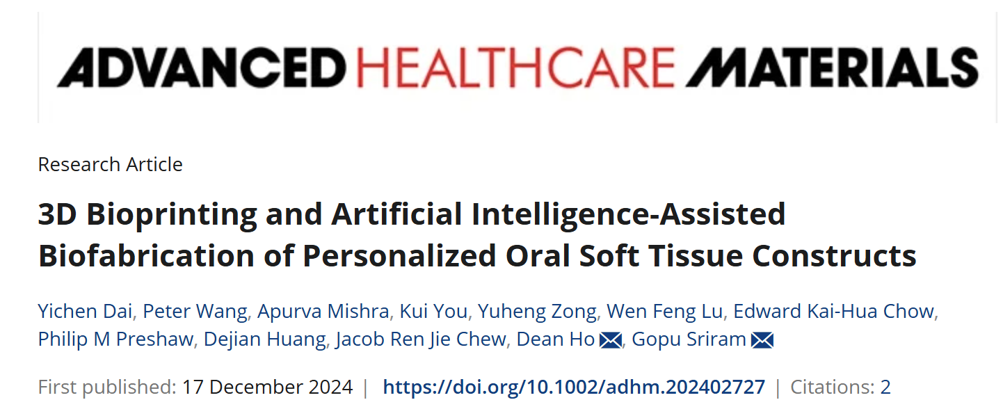 研究成果以题为“3D Bioprinting and ArtificialIntelligence-Assisted Biofabrication of Personalized Oral Soft TissueConstructs”的发表在《先进医疗材料》上,项目得到了国家增材制造创新集群和国家大学卫生系统的资助。