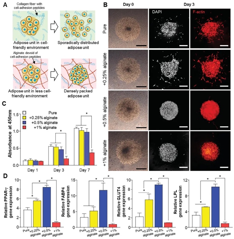 3. 使用含海藻酸盐的混合支撑生物墨水创建致密细胞环境的嵌入式生物打印,采用细胞培养观察、定量分析和基因表达检测等研究方法,研究了海藻酸盐浓度对前脂肪细胞分布、增殖和分化的影响。结果表明,含0.5%海藻酸盐的混合生物墨水能有效防止细胞分散,促进局部增殖,显著上调早期成脂分化标记基因的表达,为构建致密细胞环境、促进成脂分化提供了最佳条件。