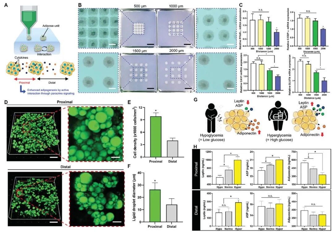 5. 基于脂肪单元排列的形态和功能评估,运用细胞培养、基因表达分析、染色观察和激素水平检测等研究方法,研究了脂肪单元间距对脂肪生成、细胞形态和内分泌功能的影响。结果表明,较小的脂肪单元间距(小于1000μm)可促进脂质滴形成相关基因的表达,提高细胞密度和脂肪细胞直径,增强内分泌反应的动态功能,证明适当缩小脂肪单元间距能促进脂肪生成成熟和增强内分泌功能。