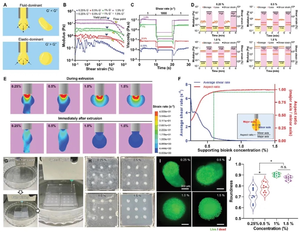 2. 嵌入式组织单元打印的开发,运用实验测试、数值模拟和细胞染色分析等研究方法,研究了不同浓度支撑生物墨水对脂肪单元形成的影响。结果表明,1%和1.5%浓度的AdECM生物墨水在流变性能上更优,能为细胞提供稳定支撑,形成更规则的球形组织单元;确定0.6%的支撑生物墨水浓度理论上可使组织单元的纵横比达到0.95,且基于此选择1%支撑生物墨水浓度进行后续实验,确保实验的稳定性和可靠性。
