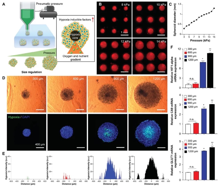 4. 开发优化脂肪单元直径的嵌入式组织单元打印方法,通过调节气压控制脂肪单元大小、缺氧检测和基因表达分析等研究方法,研究了不同大小脂肪单元的缺氧情况及对细胞功能的影响。结果表明,直径大于900μm的脂肪单元出现明显中央缺氧,而直径为600μm的脂肪单元可最大程度减少缺氧并保持细胞功能,确定后续实验采用该直径的脂肪单元以确保实验结果的一致性和可靠性。