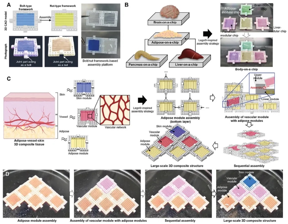 8. 快速组织组装技术在开发大规模3D复合结构中的潜在应用,通过设计组装策略、构建3D替代结构和实际组装实验等研究方法,研究了快速组织组装技术在构建复杂组织构建体中的应用潜力。结果表明,该技术可利用螺栓/螺母框架式组装平台精确对齐和分层组装各种模块,成功创建大规模脂肪 - 血管 - 皮肤结构,展示了技术的适用性和可扩展性,为构建更复杂的组织工程结构提供了新途径。