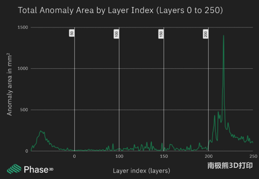 另一个案例研究涉及在EOS M270机器上的激光粉末床熔合 (LPBF) 3D 打印组件,进一步证明了边缘检测技术的实际优势。一家未公开的航空航天制造商面临由不一致的孔隙率和内部几何形状引起的零件故障,其原因是涂覆刀片上的粉末堆积间歇性地掉落到构建表面上,技术人员怀疑存在这个问题,但无法使用标准成像工具进行确认。在机器上安装 Fringe Inspection 系统后,问题立即通过高分辨率高度图显现出来。系统检测到落入熔池的粉末滴高达 200 µm,是正常层厚的四倍。