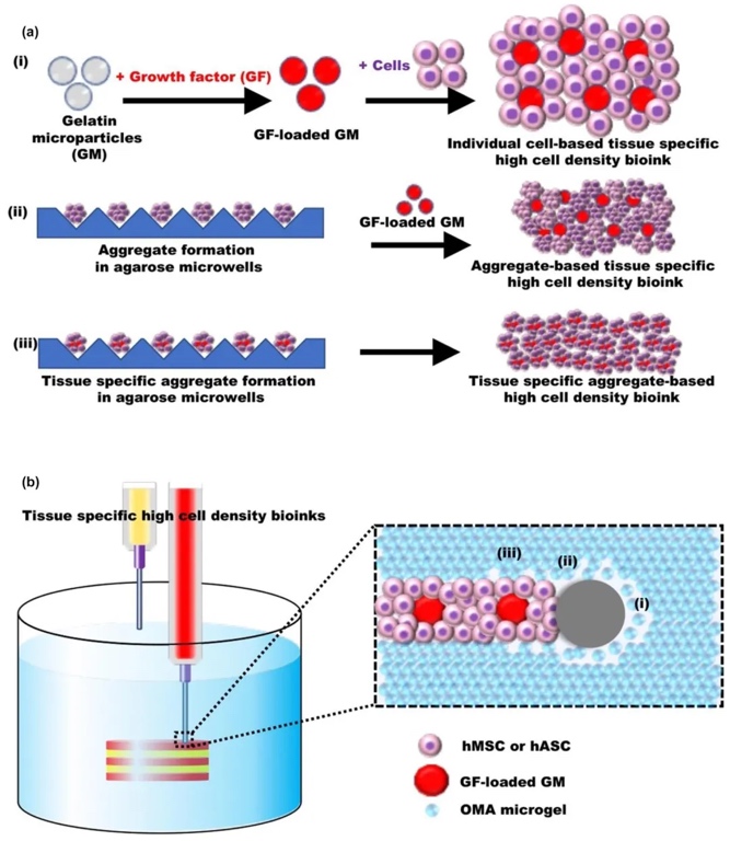 来自美国伊利诺伊大学芝加哥分校的Oju Jeon和Eben Alsberg教授团队合作,提出一种创新策略来解决这些痛点。他们将组织特异性高细胞密度生物墨水3D打印到光交联可降解水凝胶微颗粒支撑浴中,制备出新型生物制造组织。通过在生物墨水中加入负载生长因子的明胶微颗粒,不仅实现生长因子的持续释放和精准调控,还成功制备出多种组织特异性生物墨水,构建出如骨软骨组织等多相组织。相关工作以“Biofabrication of engineered tissues by 3D bioprinting of tissue specific high cell-density bioinks”为题发表在《Materials Today》上。
