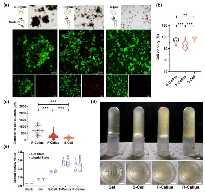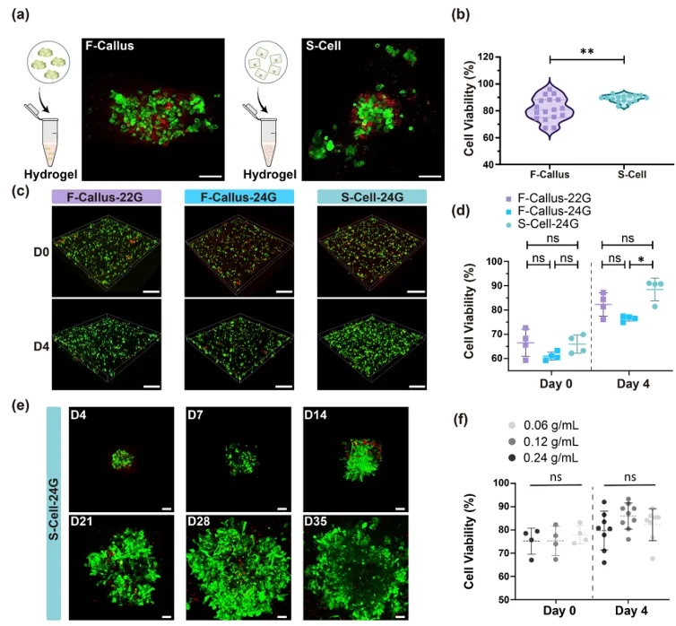基于悬浮培养获得的细胞团(S-Cell)的墨水活性与均匀性更好。本研究首先从胡萝卜外植体培养获得常规愈伤组织(R-Callus),随后通过物理破碎获得离散化愈伤组织(F-Callus),并采用悬浮培养获得细胞团(S-Cell)。其中S-Cell的尺寸最小(174±79 μm),活死染色结果表明,三种细胞形态的初始存活率均较高(R-Callus ~93%,F-Callus ~85%,S-Cell ~97%),因在制备过程中受机械剪切作用,F-Callus的存活率相对较低(图2)。