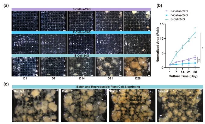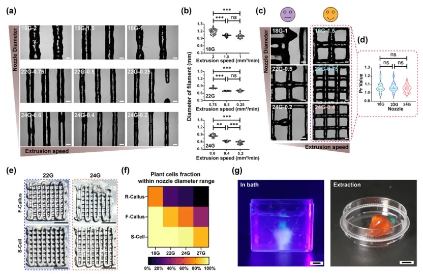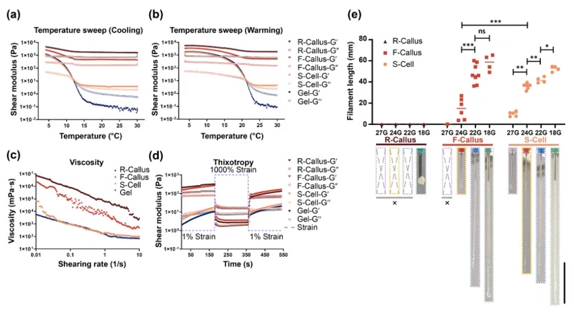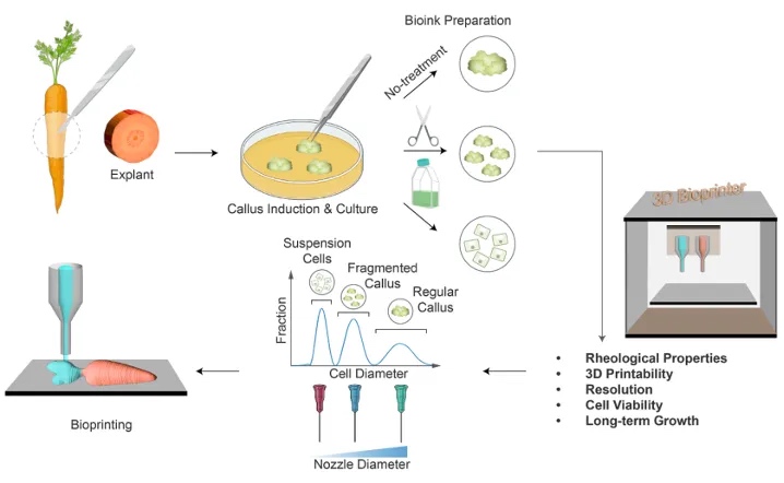 近期,清华大学机械系欧阳礼亮团队以胡萝卜细胞为研究对象,系统探讨了植物细胞团形态对生物墨水性能的影响,并提出“植物细胞团尺寸与针头内径匹配”的策略,旨在为植物细胞的工程化应用提供参数优化方案(图1)。